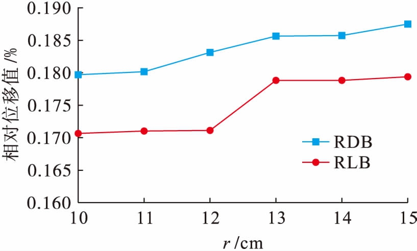 3) 目标函数.为了方便计算,本文巷道所需喷混支护为等厚度,喷射混凝土截面积最小,即衬砌厚度r最小.分析过程显示当r大于等于10 cm时才满足稳定和位移的要求.巷道顶、底板及边墙两帮相对位移值随厚度r的变化曲线如图8所示.