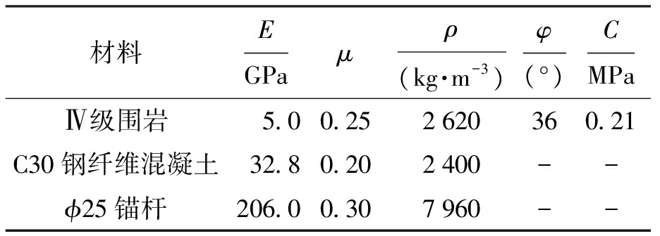 各部分材料的力学参数如表2所示,其中,尾矿砂钢纤维喷射混凝土的弹性模量通过室内弹性模量试验获得,其他参数可查阅规范进行选取,超前锚杆加固区围岩力学参数按刚度等效原则计算,其中,弹性模量E=5.33 GPa,泊松比μ=0.25,密度ρ=2 620 kg/m3,内摩擦角φ=40°,粘聚力C=0.25 MPa.