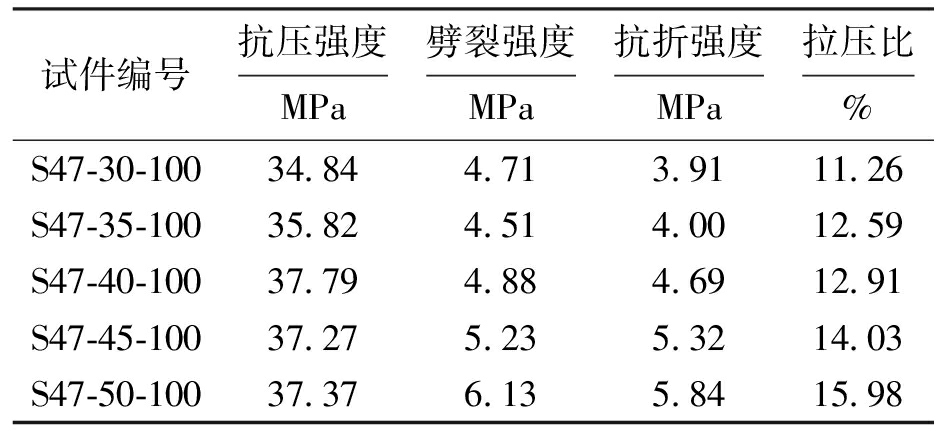 按照《钢纤维混凝土试验方法》(CECS13:89)进行制作与养护试件.在标准养护室养护28 d后,分别对相应混凝土试件进行抗压强度、劈裂强度、抗折强度试验,其结果如表1所示.