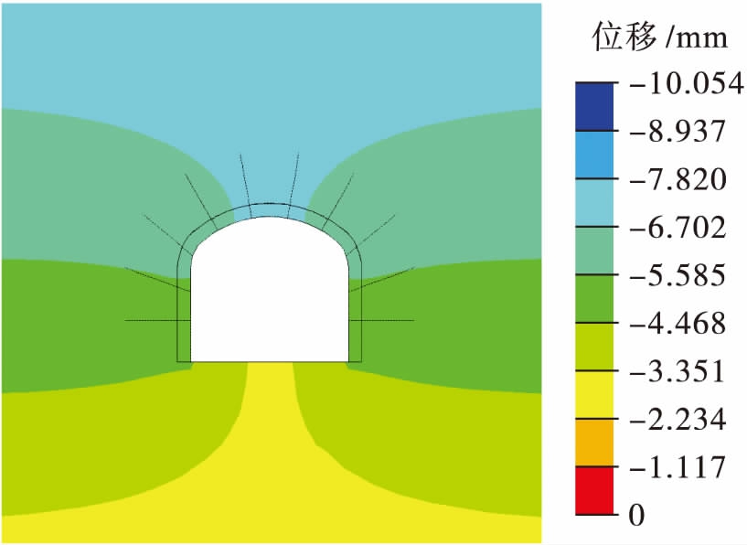 洞室的开挖导致洞周岩体发生位移,相对于自重应力场,拱顶向下最大沉降量为1.13 mm,洞底向上最大位移为2.2 mm.边墙向洞内方向最大位移为0.193 mm,巷道开挖后拱顶的位移云图表明,其位移变化不是很大,说明该软弱围岩段在钢拱架+钢筋网+喷砼+注浆支护方式与超前锚杆相结合的支护下,围岩的变形受到了有效的抑制.后期加固支护很大程度上限制了洞周松动圈的塑性发展.