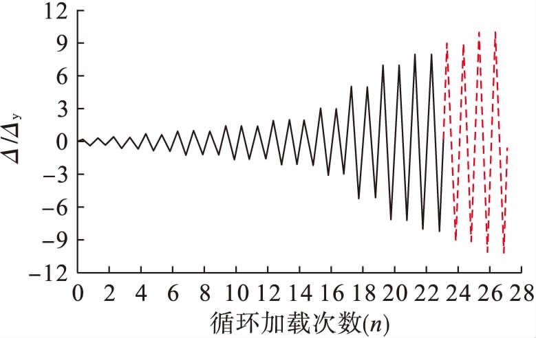 本文中钢管混凝土框架试验边界条件和荷载的施加形式明确,柱脚固接,两柱顶施加轴向荷载,工字钢梁端右侧施加水平循环荷载.在有限元计算模拟中,对方钢管柱脚采取嵌固的边界条件,加劲板底部同样采用嵌固边界,由于只有柱顶板和底板限制了核心混凝土的轴向位移,所以核心混凝土的边界仅需约束其轴向位移即可.在荷载施加的过程中,梁端右侧水平循环荷载的加载过程采用位移加载控制,加载历程如图5所示,其中,Δ/Δy为试验过程中模型的位移值与模型屈服位移的比值.