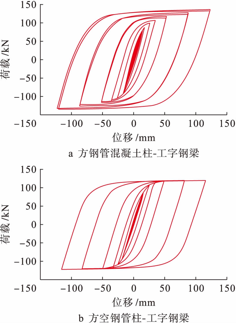 工字钢梁两种框架结构的力学性能,运用有限元软件分别对上述两种框架结构进行了全尺寸建模,完成非线性有限元计算分析.结果表明,计算结果与实验数据吻合较好,验证了所建模型的准确性;两种框架结构的滞回曲线均为饱满的梭形,无明显的捏缩现象,且方钢管混凝土柱
