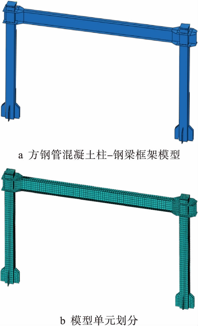 工字钢梁框架模型采用文献[4]中实际试验数据120 mm×120 mm×3.46 mm方钢管柱和160 mm×80 mm×3.44 mm×3.44 mm(梁高、梁宽、腹板厚度、翼缘厚度)工字钢梁.工字钢梁和外加强环通过焊接连接在方钢管柱上,模型中采用绑定连接.方钢管柱、工字钢梁和加强环板模型采用S4R壳单元,核心混凝土采用C3D8R实体单元建模.定义混凝土和方钢管之间的接触单元[7]时,应该考虑其切向行为和法向行为,切向行为采取罚摩擦公式,摩擦系数为0.6;法向行为定义为“硬”接触.一榀方钢管混凝土框架模型尺寸如图3所示(单位:mm).有限元软件建立的框架模型及单元划分模型如图4所示.