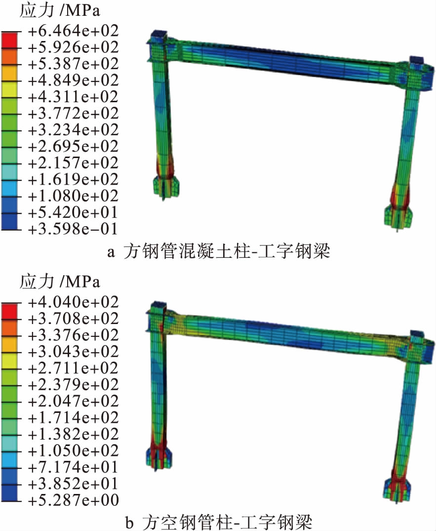 工字钢梁框架结构统一计算到5Δy时对应的应力云图如图8所示.