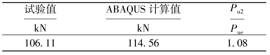 本文参考文献[8]中确定钢管混凝土柱屈服点的方法,根据骨架曲线来确定框架结构水平承载力.试件水平承载力计算结果与试验结果的比较如表1所示,其中,Pu2/Pue为钢管混凝土模型极限水平荷载模拟值与试验值的比值.