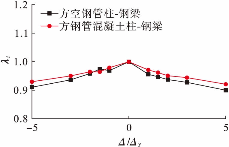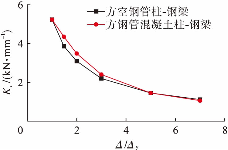 图12为两种框架结构的刚度退化曲线.图12中显示无混凝土的方空钢管柱