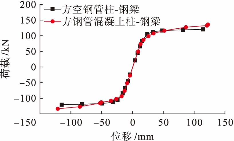 位移曲线.由图9可知,两种组合结构的滞回曲线都呈饱满的梭形,说明两种结构的塑性变形能力很强,具有良好的抗震耗能能力.相比之下,钢管混凝土柱框架结构的滞回曲线更加圆滑、饱满.在框架结构的受力过程当中,受到方钢管柱约束其轴向位移的混凝土处于三向受压状态,从而提高了混凝土的受压承载力.正因为混凝土的存在,延缓了方钢管柱的局部屈曲变形,进一步提高了钢管混凝土柱的承载力.