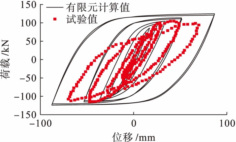 模拟计算得到的滞回曲线为较饱满的梭形形状,表明整个框架结构具有很强的塑性变形性能和抗震耗能能力.有限元分析得出的模型整体刚度、水平极限承载力均大于试验结果,滞回环也相较试验结果更加饱满.分析表明,有限元模拟与试验值基本接近,总体上稍微偏大是由于有限元计算分析中未模拟结构的初始缺陷、安装过程中产生的误差等因素的影响.对比结果显示,运用有限元模拟的方法可以较好地对方钢管混凝土柱