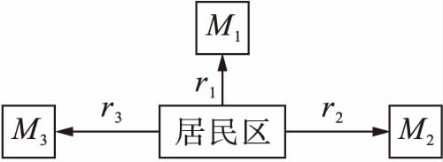 在图5中,以居民区为中心,M1、M2、M3表示要确定的未来用地类型;r1、r2、r3分别表示待定的用地类型M1、M2、M3到居民区的距离.根据城市规划的某些准则,靠近居民区的未来用地类型只能是商业用地或者市政用地,工业用地应远离居民区;而离居民区距离较远的未来用地类型则可能是商业用地、市政用地或者工业用地.因此,图5中,M1未来用地类型最可能为商业和市政用地;M2、M3未来用地类型最可能为工业用地,其次可能是商业用地,而最终用地类型的确定则主要由政府规划决定.基于粗糙集的决策表、元胞自动机原理及待定的用地类型转换应满足以下规则[16]:1)IFC1=1 andC2=3 andC3≠1 andC5≠1,ThenD=1;2)IFC1≠3 andC2=1 andC5≠3 andC7≥2,ThenD=2;3)IFC1=2 andC2=2 andC4=3 andC6≠3 andC7≥2,ThenD=3;4) IFC2=1 andC3=1 andC5=1,ThenD=4.