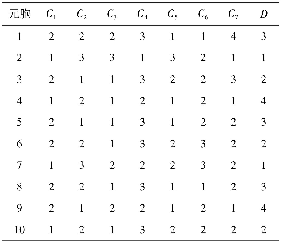 通过GIS平台获取元胞的空间分布和相关属性数据并生成数据表.在GIS平台上采用分级聚类法对条件属性进行离散及初步约简,把样本值模糊离散化为4个定性的属性值(用1、2、3、4分别代表“很近”、“近”、“较远”和“远”)及土地分类决策属性D(用1、2、3、4分别表示工业、商业、居民和市政用地类型).为提高不同土地使用类型决策转换规则精度和效率,针对一些通常在规划年内用地类型不会发生变化和负荷值很低的元胞,通常在数据表中给予剔除,部分离散化的决策表如表1所示.