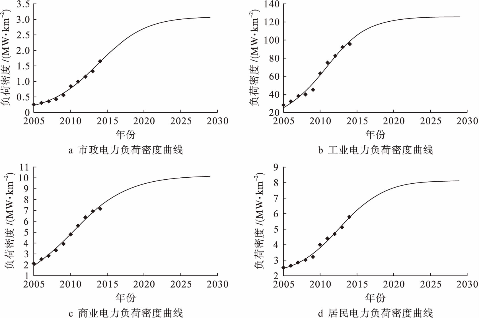 在进行城市空间饱和负荷预测的过程中,需要根据不同产业的用电特性和用地类型将电力用户进行合理分类.为了简化研究,在忽略其他因素影响的条件下,通常将城市用地类型简单地划分为:市政用地、商业用地、工业用地和居民用地.由于不同的用地类型具有不同的负荷密度特性,在饱和负荷密度曲线的求取中,本文先根据电力负荷历史数据得出不同的用地类型的负荷密度,然后采用logistic曲线模型,利用负荷密度值的历史数据预测出各类负荷的负荷密度曲线.