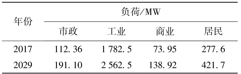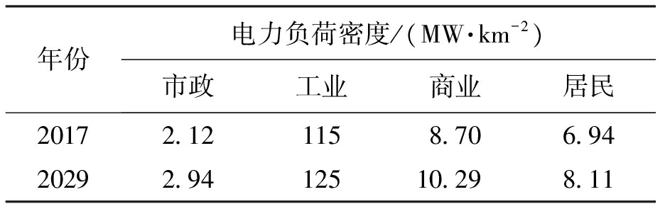 为了方便下文研究,根据图4中市政、工业、商业、居民的电力负荷密度曲线分别求出2017、2029年市政、工业、商业、居民对应的电力负荷密度值如表3所示.