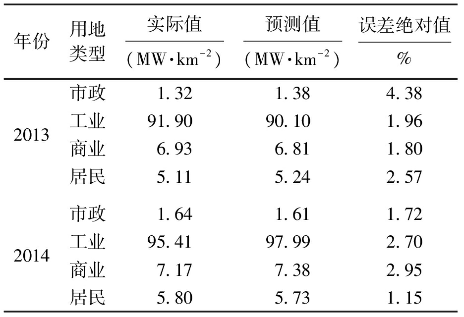 由表2可知,2013、2014年不同用地类型电力负荷密度的误差绝对值均低于5%,满足负荷预测的误差精度要求.结合图4以及表2分析可知,基于logistic曲线的电力负荷密度预测方法具有一定有效性.