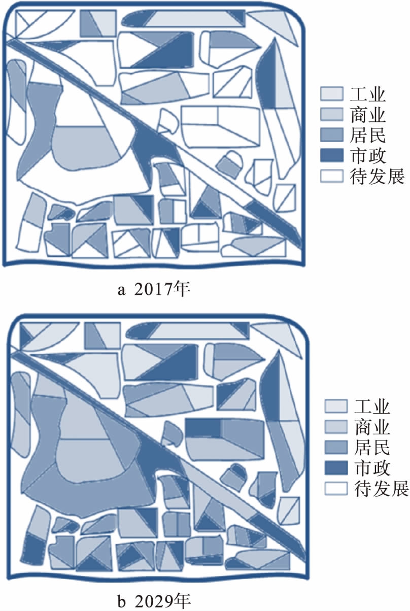 为了研究方便,本文根据某规划城区的部分小区,结合政府长期规划目标,在GIS平台上基于粗糙集和元胞自动机理论规划出2017、2029年规划区域各用地类型面积的发展情况,如图6所示.