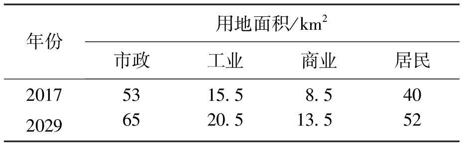 根据2017、2029年规划区域各用地类型面积的发展情况,在GIS平台上可以分别计算出2017、2029年市政、工业、商业、居民的用地面积,如表4所示.