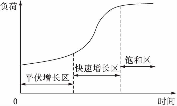 饱和负荷指城市建设发展到一定阶段后,受人口、土地、环境等因素的影响,城市用电总负荷的增长速度放缓甚至停滞的一种状态.饱和负荷密度的影响因素主要包括人均GDP、人口密度、用地性质和区域的经济规划布局等.随着城市经济指标体系的变化,饱和负荷密度的总体走势呈现出先发展后趋于饱和的“S”型状态.某一地区的负荷增长曲线如图1所示,曲线增长呈现为“S”型曲线.由图1分析可知:负荷首先经历平伏增长阶段,然后在经过快速增长阶段后,进入低速平缓增长阶段,即饱和负荷阶段.在区域供电中由于供电设备的容量有限,且可利用的土地面积有限,故研究区域的面积越小,“S”型曲线的特征越明显.