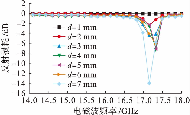 电磁波频率关系.吸波材料力求具有涂层薄、频带宽和反射损耗强的特点.图8中复合材料涂层厚度分别为1~7 mm,由图8可见,随着复合材料涂层厚度的增加,反射损耗逐渐增大.当复合材料涂层厚度为7 mm时,在17.18 GHz电磁波频率处反射损耗达到最大幅值,对应频带宽为16.8~17.67 GHz.由此得出,ZnO/C复合材料在电磁波的微波区域具有较好的反射率.ZnO/C复合材料具有良好的吸波性能,这主要归因于复合材料的结构特性、电子极化和界面极化等的共同作用.