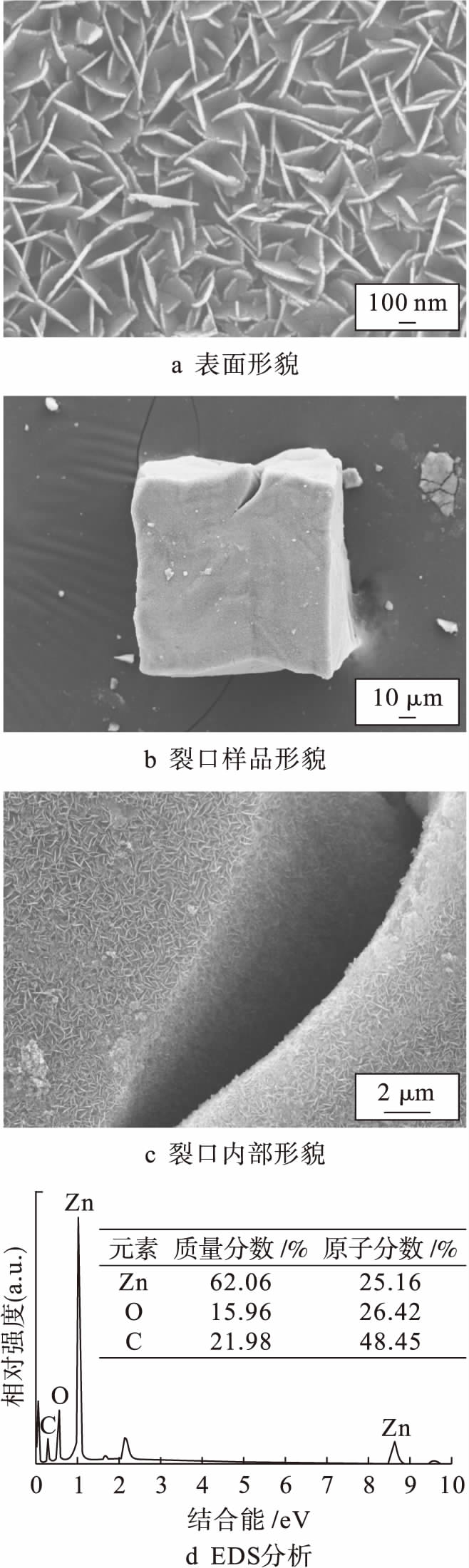 为了进一步确定ZnO/C复合材料中元素的分布情况,对复合材料微观区域的元素分布进行定性定量分析.利用元素分布映像图谱对复合材料的EDS分层图像及O、Zn和C元素分布进行分析,结果如图6所示.由图6a可见,ZnO/C复合材料由薄片状组织堆叠而成.由图6b~d可见,ZnO/C复合材料中O、Zn和C元素均匀分布.