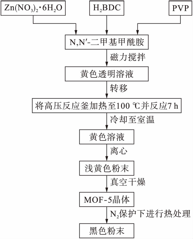 称取适量金属有机骨架MOF-5放入氧化铝舟中,随后将氧化铝舟置入管式炉内,在N2保护下进行热处理.当自然冷却至室温后,即可得到黑色粉末.具体实验流程如图1所示.