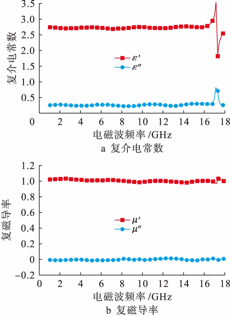 式中:ε′为复介电常数的实部;ε″为复介电常数的虚部.介电损耗的实部和虚部分别代表电场储能与电场耗能程度.介电损耗因子值越大,材料的吸波性能越好.