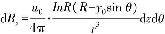 利用矢量乘法可计算得磁感应强度dB在yoz平面上的轴向分量,即