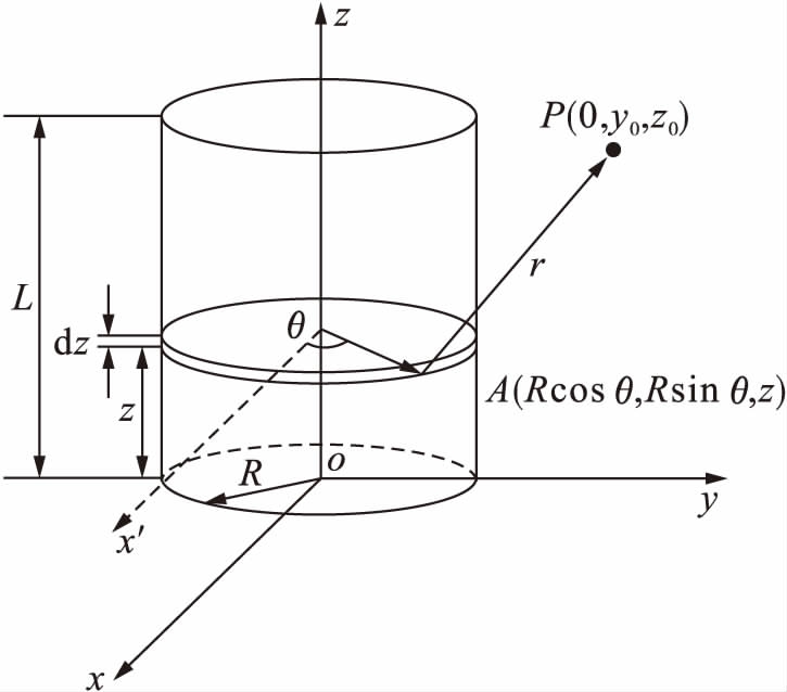 在yoz平面内取点P(0,y0,z0),在轴向方向上z处取厚度为dz的环,该环电流为I′=nldz.在A点处取电流元I′dl,根据毕奥萨伐尔定律,电流元I′dl在点P产生的磁感应强度为