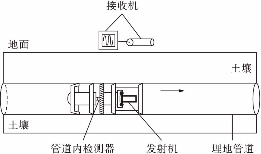 管道内检测器跟踪定位主要根据发射机经过接收机下方时,接收机接收到的信号变化判断发射机位置,从而实现对管道内检测器的跟踪定位,图1所示为管道内检测器跟踪定位示意图.