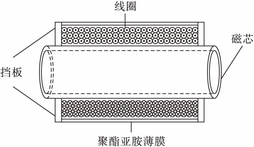 为提高发射线圈产生的磁场强度,采用漆包线缠绕磁芯形式构成发射线圈,其结构示意图如图5所示,聚酯亚胺薄膜用于绝缘和保护线圈.