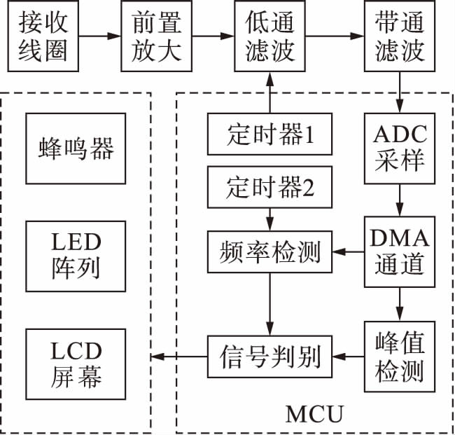 微控制器处理单元采用STM32F103RBT6单片机,其带有12位的具有直接存储器存取的ADC,满足低频信号的采样需求.接收到的信号经过信号调理电路后,满足单片机AD采样的电压输入范围.将调理后的信号利用MCU内部的ADC进行采样,通过DMA通道对信号进行峰值检测和频率检测.将采集后的数据存储到片内存储中,设置阈值,对信号进行判别,利用蜂鸣器和LED指示灯阵列变化情况,判定接收机与发射机相对位置的变化.