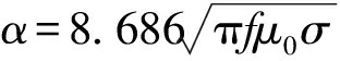 由式(1)、(2)可知,信号的衰减率α与信号频率f和介质的电导率σ有关.当介质电导率σ一定时,信号频率f越低,衰减率α越低,趋肤深度δ越大.