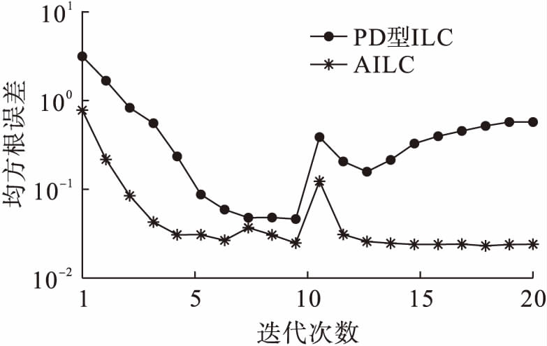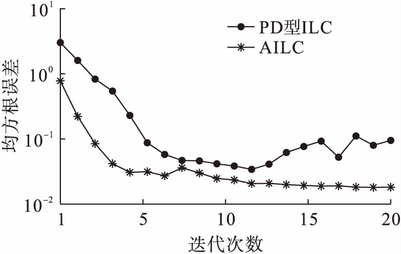 图7为PD型ILC和AILC迭代的均方根误差曲线.由图7可以看出,采用AILC时系统的收敛速度更快,而且跟踪精度更高,均方根误差基本较为稳定;而采用PD型ILC时,均方根误差值从第13次迭代时开始有上升发散趋势,并且变得不稳定.这是因为参数摄动所引起的不确定性扰动为随机的非重复性扰动,而PD型ILC由于对其只能积累,不能抑制,因此均方根误差会随着迭代次数的增大而变得不稳定甚至发散.
