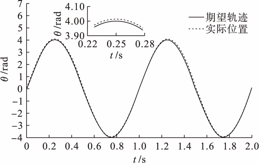 选择PD反馈控制器参数为Kp=5,Kd=8,自适应学习增益为ρ=30,滤波器Q中1/ω值取为0.02,迭代次数为20次,对电机进行位置跟踪控制曲线如图3所示.由图3可以看出,经过20次迭代,实际位置与期望轨迹基本重合,其跟踪效果良好.