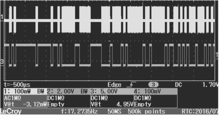 ALD手持控制器的测试主要包括硬件电气性能测试和AISG协议互操作测试.电气性能主要包括了OOK通信测试和能耗操作工作时间测试,OOK模块实测解调灵敏度为-15 dBm,调制发射功率最大为12 dBm,满足AISG规范要求,调制波形如图5所示.图5中上方的波形为单片机输出的TX信号,下方的波形为OOK调制信号.