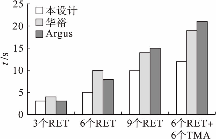 对RET控制功能的测试主要包括扫描、调节下倾角、天线校准、获取告警以及下载配置文件等操作;对TMA的测试项目包括扫描、设置塔放工作状态、获取增益及获取告警等.本文设计的手持控制器完成了与所有被测ALD设备的互操作功能测试,结果表明,该便携式控制器操作简便、控制功能完善,且协议兼容性好.最后进行了不同条件下与其他厂家手持控制器设备扫描的对比测试,选取了实际应用中常见的4种应用场景:3个RET、6个RET、9个RET以及6个RET和6个TMA共存的情况,扫描时间测试结果如图7所示.在这4种情况下,本设计的扫描速度优于华裕和Argus的同类产品,特别当总线上同时存在来自不同厂家的不同类型ALD时,扫描速度优势更为明显.