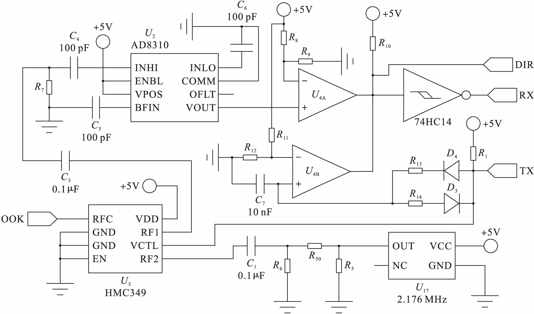 图2中RX和TX分别与单片机UART模块的RXD和TXD相连,OOK端口为载波信号.STM32单片机的TX引脚工作在开漏模式,通过上拉电阻R1实现高电平输出.U17为源晶振,调制模块采用了射频开关HMC349,数据发送期间,当TX为低电平时,OOK输出2.176 MHz的载波信号,为高电平时,无载波信号输出.信号解调采用了对数放大器AD8310,其VOUT引脚的电平状态直接反映了OOK信号线上否有载波信号,通过开漏输出比较器U4A与阀值检测电压比较检出接收信号,最后通过施密特反相器74HC14得到接收信号RX.为了防止TX端发送的信号绕回到接收端RX,设计了由D3、D4、R13、R14和C7组成的非平衡充放电电路,当TX为低电平时,C7放电电阻小,放电速度快;TX为高电平时,C7的充电速度则要慢得多,从而在TX发送信号期间,比较器U4B的同相端电压低于反相端,拉低其输出信号,保证了在TX发送信号过程中RX始终为空闲状态高电平.
