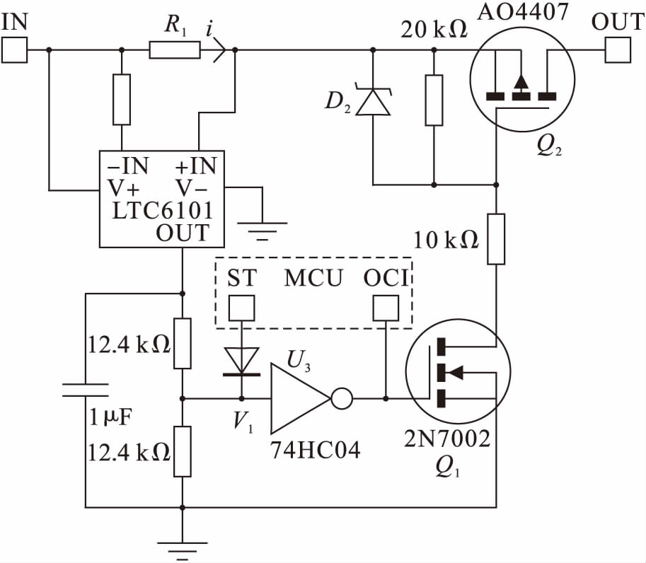 本设计采用LTC6101作为高边电流检测放大器,当输出电流超过2 A时,V1高于反相器门限电压,OCI为低电平,Q2关断,自动切断对ALD设备的供电.为了避免过流误触发,本电路具备自动重试功能,切断供电后过流现象消失,经过一定的迟滞时间后会重新开启供电.如果ALD设备短路持续存在,OCI口将出现周期性脉冲信号,单片机据此便可判别是否发生了输出短路故障,并通过ST端口输出高电平,彻底切断供电输出,并在液晶上给出ALD短路提示信息.