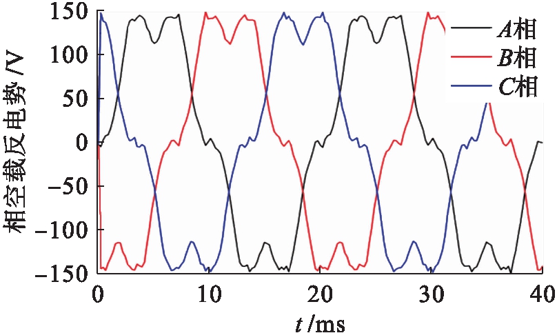 空载反电势是电机的一个重要参数,对电机的动、稳态性能均有较大的影响.q=0.5时电机的空载反电势波形如图3所示,从仿真结果中可以看出,相空载反电势有效值为103.9 V,与设计值103 V相符合,说明方案电磁设计的正确性,但反电势波形正弦度不高.