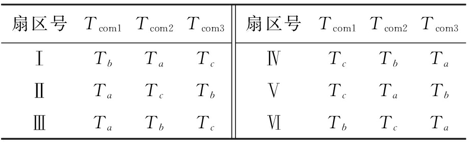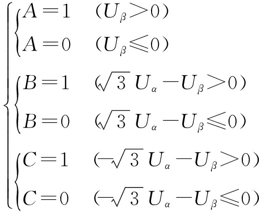 然后令N=A+2B+4C,根据计算出来的N值确定电压矢量所处的扇区号.计算得到N与扇区号的对应关系如表2所示.