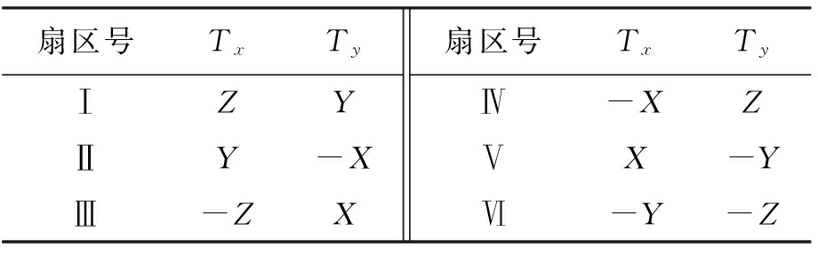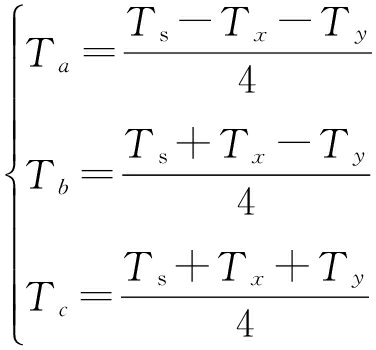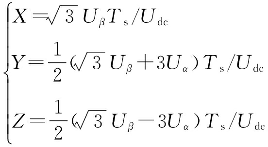 将任意空间矢量沿Ux、Uy方向分解,把其作用时间分别设为Tx和Ty,并将周期设为Ts,处于任意扇区的电压矢量都可用相邻扇区的基本Udc进行合成,所用时间的计算公式为