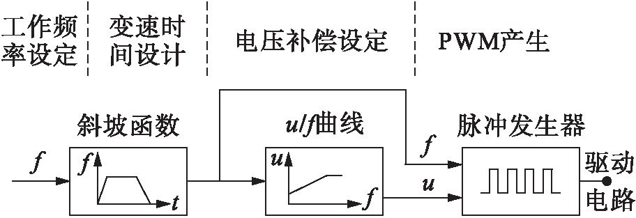 恒V/F控制原理图如图8所示,根据输入的目标转速给定一个频率,然后通过一个斜坡函数来控制频率的升降速度.当输入频率低于额定频率时,可通过改变V/F函数发生器的特性来补偿定子阻抗压降;当输入频率超过额定频率时,控制电机端电压不变,而是增加去磁电流削弱气隙磁通,实现了弱磁控制.