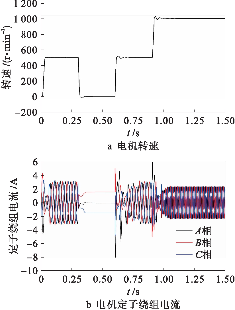为了真实地模拟每极每相槽数在q=0.75时永磁同步驱动系统宽范围调速时的运行情况,利用ANSYS Maxwell和ANSYS Simplorer有限元分析软件进行了驱动电路与电磁场无缝耦合仿真.在耦合仿真时,控制器可以根据编入的控制算法,真实模拟功率开关器件实现的开通关断过程,同时也考虑了电机本体部分的极槽配合、运动特性等情况.将空间矢量脉宽调制方式与开环无位置传感器控制算法相结合控制各IGBT通断,进而实现速度的调控.将电机及控制器各参数输入完毕后进行仿真,得到电机随控制器的动态响应结果如图10所示.