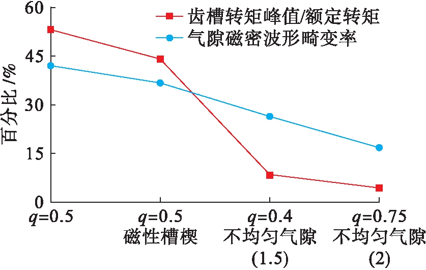由于q=0.5时永磁同步电机中空载反电势波形正弦度不够,气隙磁场谐波含量较大,且齿槽效应带来的脉动转矩较大,这些都不利于电机的低噪声平稳运行[8-9].为了对上述方案电机性能进行改善,考虑在原有定转子内外径等基本结构尺寸不变的情况下,通过增加磁性槽楔、调整极槽配合及不同程度的不均匀气隙结构等手段,对电机的齿槽转矩峰值占额定转矩百分比和气隙磁密波形畸变率这两个电机平稳性的主要影响因素进行优化,优化结果如图6所示.