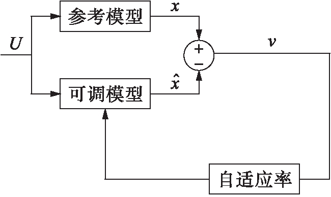 由于驱动流变仪的永磁同步电机采用恒压频比的开环控制策略,所依据的电机模型为稳态时的模型,因此,不具备很好的动态控制性能.为了获得良好的动态控制性能以提升控制精度,在原有控制基础上,本文融入了无位置传感器控制算法中较为优越的模型参考自适应算法,以此来对电机转速和位置进行估算.模型参考自适应算法的基本原理是将已知变量方程的电机模型作为参考,将含有未知变量的方程作为可调模型,并设参考模型的输出变量与可调模型的输出变量具有相同的含义,通过控制两个输出变量间的偏差获得较优的自适应律,从而调节模型输出[15].模型参考自适应算法原理框图如图9所示.