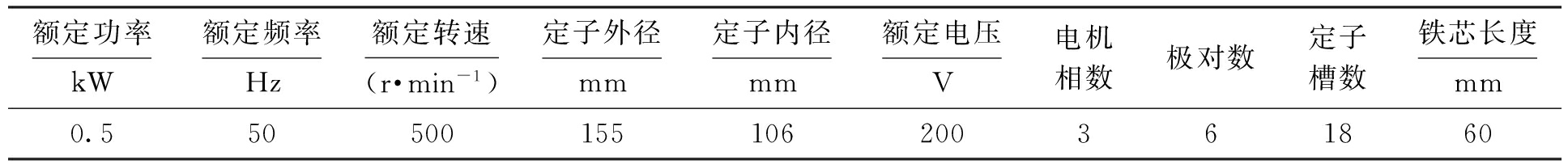 为了提高驱动电机的速度分辨率,必须采用多极结构,而流变仪驱动部分的安装空间有限,因此需要采用定子槽数较少的分数槽结构.由于定子尺寸小,且通用变频器所能提供的最低频率为0.01 Hz,需采用定子槽数为18、极数为12的极槽配合,此时每极每相槽数q=0.5,电机所达到的最低转速为0.1 r/min.相应电机主要参数如表1所示,而基于电机参数建立的有限元仿真模型如图1所示.