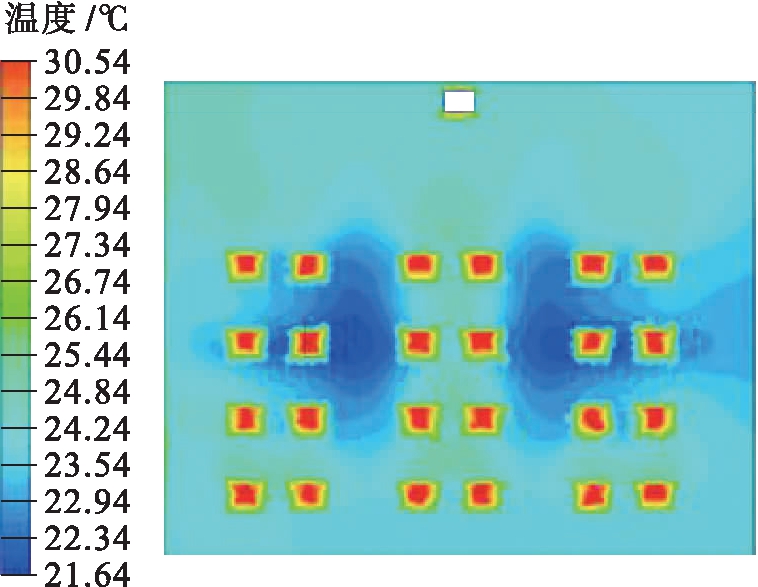 1) 顶送风情况下所得室内温度场分布绝大部分处于23.7~25 ℃之间,满足夏季室内人员舒适度要求.但侧送风方式会造成会议室内西墙附近温度偏低,局部区域内温度低于23 ℃,不利于会议室内工作人员的思考和注意力的集中.