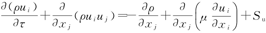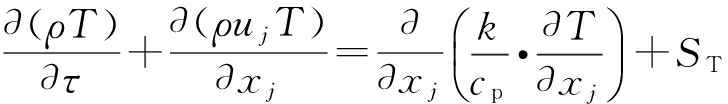 本文使用CFD软件进行数值模拟,计算过程中不考虑空气与室内各面摩擦情况,会议室内空气为稳态湍流,不可压缩且符合Boussinesq假设,采用标准的k-ε模型.会议室内通风的数学模型控制方程包括连续性方程、动量方程和能量方程[10],其表达式如下所示.