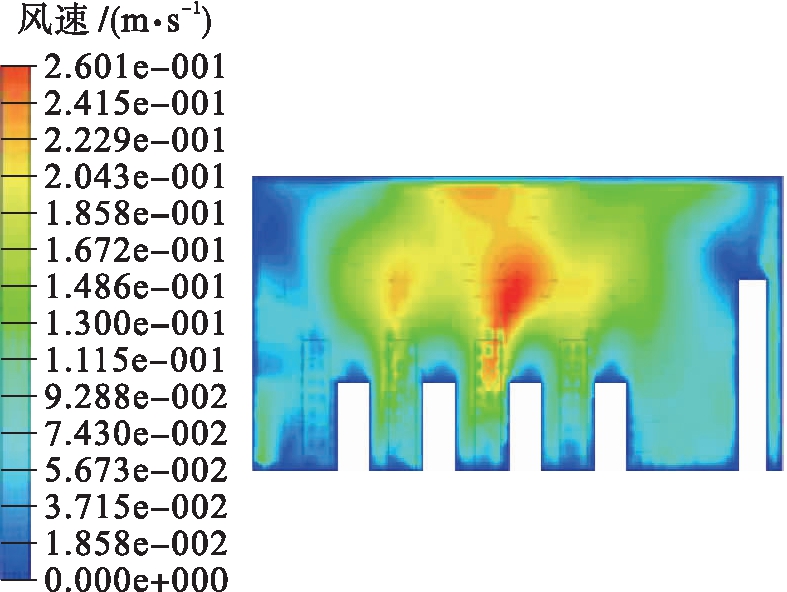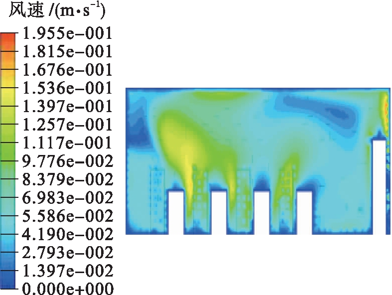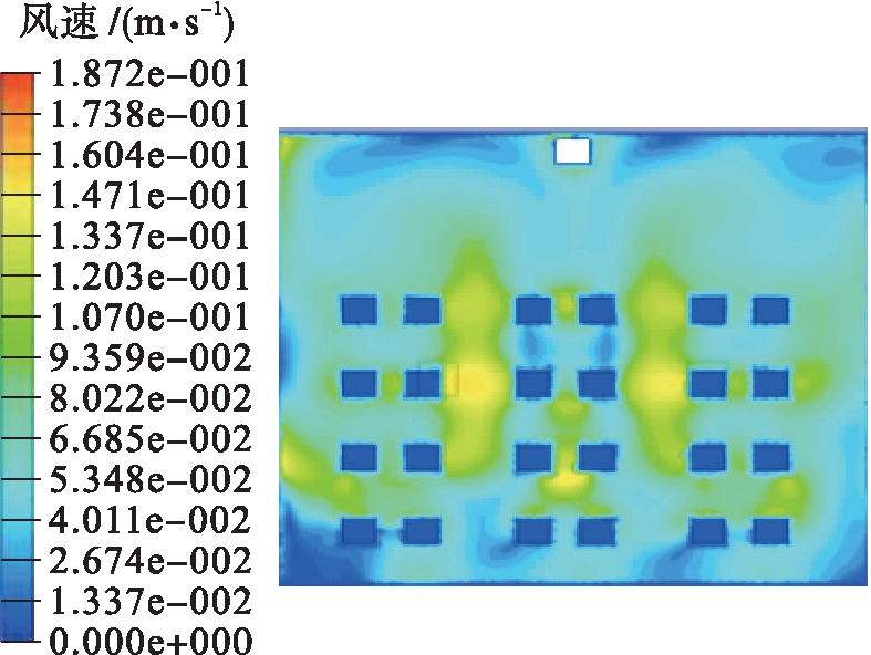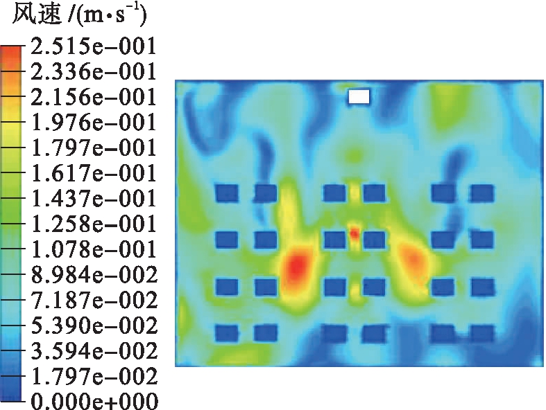 在侧送风方式下,气流从侧送风口射出沿射流方向送至人员工作区域,由图11可知,由于气流速度随输送距离的增加逐渐减小,再加上受重力影响,在气流到达西侧墙体时送风速度普遍小于0.089 84 m/s,Z=1.2 m截面上最大风速为0.251 5 m/s,工作区域内风速均小于0.3 m/s,符合空调室内有关速度的设计要求.为了与侧送风方式下室内的速度分布情况进行对比,本文截取了顶送风方式下Z=1.2 m截面模拟图.顶送风情况下气流从送风口直接送至会议室内人员工作区,工作区域内气流的速度处于0.026 74~0.147 1 m/s之间,远远低于0.25 m/s,符合ASHRAE国际标准.由图13、14对比分析可以得出,X=3.75 m截面上顶送风方式下送风速度更为均匀且均小于0.3 m/s.