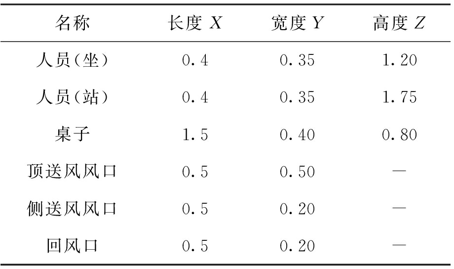 表1 室内人员、桌子、送风口、回风口的相关参数