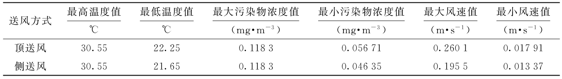 两种不同送风方式下室内温度场、污染物(甲醛)浓度场及速度场的数值对比如表2所示.