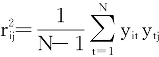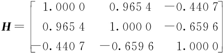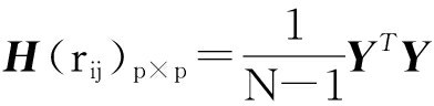 4) 计算各样本相关系数rij,得出样本相关矩阵H,则样本相关系数与相关矩阵表达式分别为